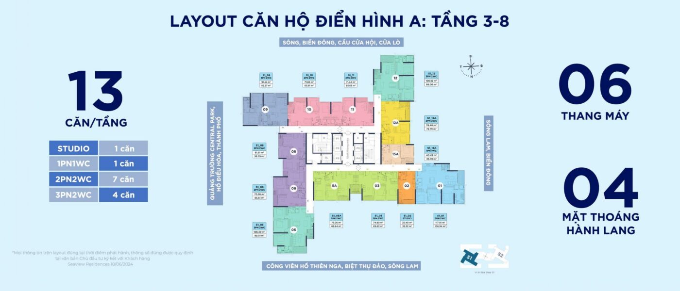 Mặt bằng toà S1 từ tầng 3 – tầng 8 chung cư Seaview Residences – Ecopark Vinh – Eco Central Park